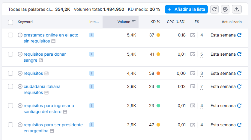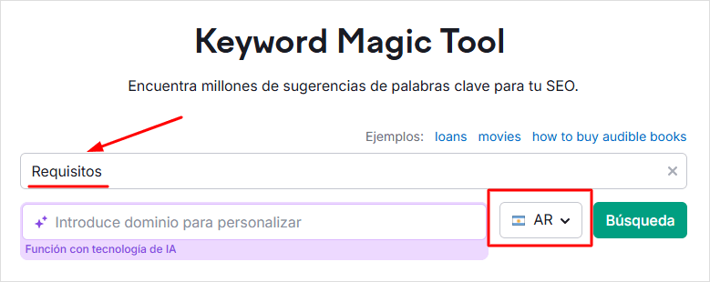 En este caso usaré keyword semilla «Requisitos», selecciono como país «Argentina» porque mi nicho está enfocado en este país, y hago clic en «Búsqueda».