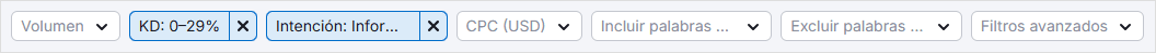 Para ello, seleccionaré solamente las palabras clave que tengan una KD o dificultad de keyword menor a 30 y una intención de búsqueda informativa.