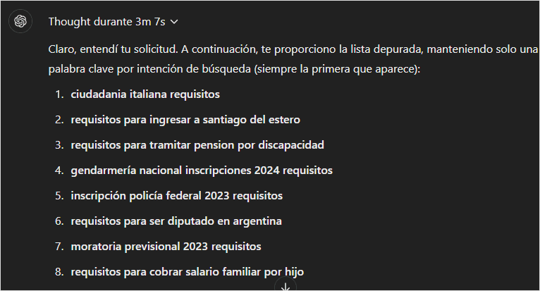 Y le pediré amablemente que detecte cuales tienen la misma intención de búsqueda, y me devuelva una lista depurada.