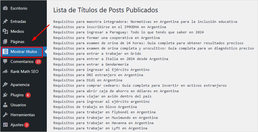 Por otro lado, regalaré el plugin que utilicé para obtener la lista de articulos publicados. Al instalarlo, te aparecerá una opción nueva en la barra lateral izquierda de WordPress.